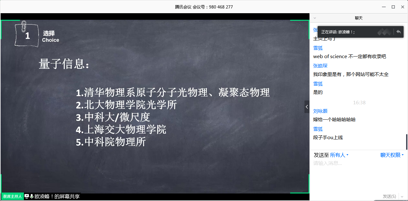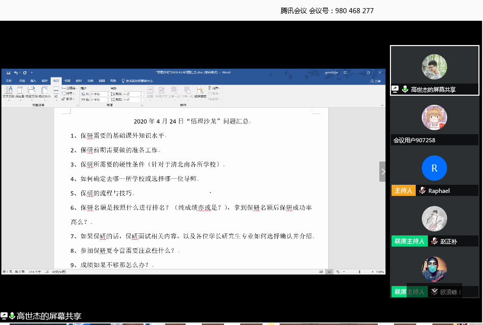 4月24日下午15点30分许,开云手机登录入口“悟理沙龙”生生交流活动在翘首以盼中揭开帷幕。本次“悟理沙龙”以“保研经验分享交流”为主题,邀请到2016级成功保研至清华大学、北京大学、南京大学的5名优秀学子与大家线上分享保研历程中的点点滴滴,交流切身体会,分享宝贵经验,共90名物理学子参与此次线上分享交流会。