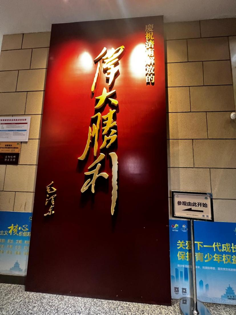 随后,同学们安静有序地走进“济南解放纪念馆”。在解放阁内,大家纷纷驻足在“伟大胜利”这四个大字面前,回想起革命先烈抛头颅洒热血、挺膺担当,不顾一切向前冲,为我们争得如今的幸福生活,不禁热血沸腾。同学们认真倾听着济南战役的历史,通过馆藏实物和复原的历史场景,近距离触摸历史、感知历史,探寻红色故事。