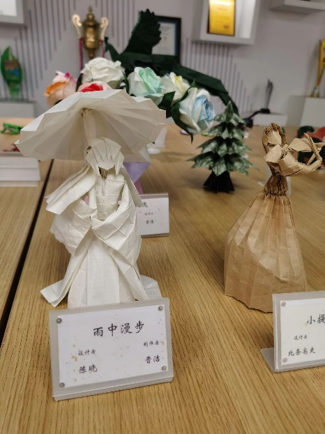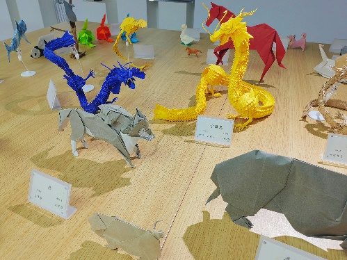展览共展出一百余件折纸作品,涵盖现代折纸、花球折纸、镶嵌折纸等各种类型,人物、动物、花卉、符号等题材一应俱全。除了晋洁、陈子欣、彭俊翔等社团成员提供的优秀作品外,还有几件由国内著名折纸艺术家设计并折制的作品在展览中亮相:陈晓老师的最新作品“匹诺康尼的折纸小鸟”、孟伟凝老师的代表作“狼”“绿孔雀”……济南折纸艺术家宋佩琦老师也为本次展览提供了数十件作品,其中包括他的代表作“汉服”。
