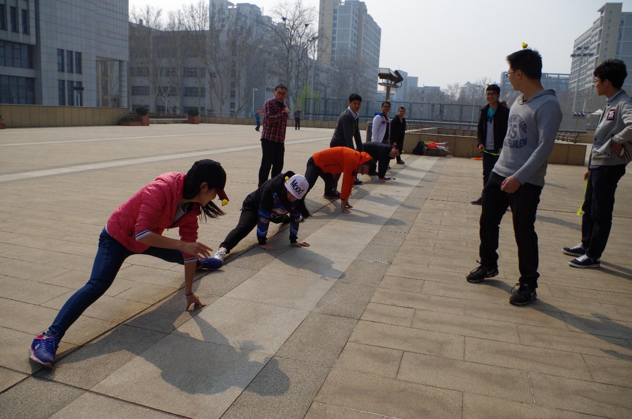 下午两点,所有活动参与者在体育馆前集合完毕,随机分为两组开始热身游戏,先进行劈腿大作战——比腿长游戏。每组队员依次劈叉并将脚连在一起,总长度最长的组获胜,经过每位队员的努力,最终第二组取得胜利。之后是“一块五毛”的抱团游戏,由五个人担任五毛,其余同学担任一块,游戏开始游戏队员围绕主持人转圈,主持人随机暂停并给出钱数,游戏者根据主持人给出的钱数抱团,落单的被淘汰。经过一段精彩的比拼,王凯等三名同学获得最终胜利。