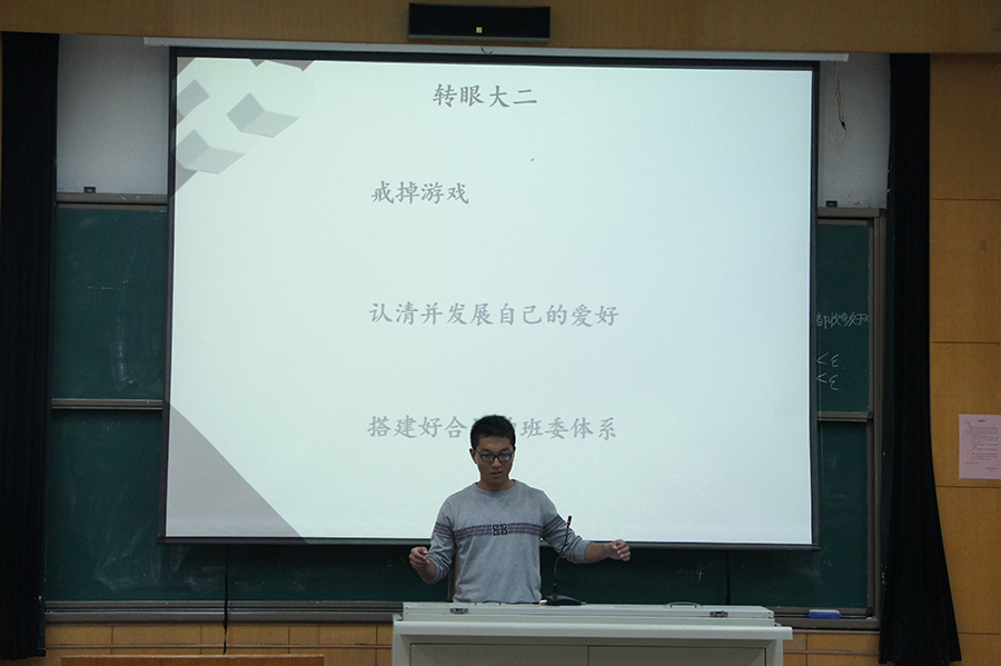 首先向新生们分享经验的是2013级杨辉。这位连续两年的国奖获得者主要对过去两年的学习生活进行了总结。他讲到大一时在国庆假期七天内把高数课本读完,但由于基础实验有些知识没弄懂对整体的绩点成绩有很大影响。所以大一下学期他吸取教训,在自己不擅长的学科上花费更多时间和努力,主要弥补了自己的弱项英语和热学,并提议新生多去图书馆借书,把不会的问题都解决掉。他最后强调“做人不要懒惰,懒惰比癌症晚期还难治疗”。