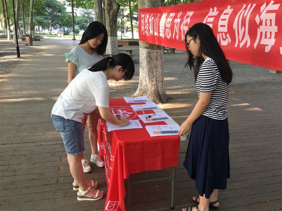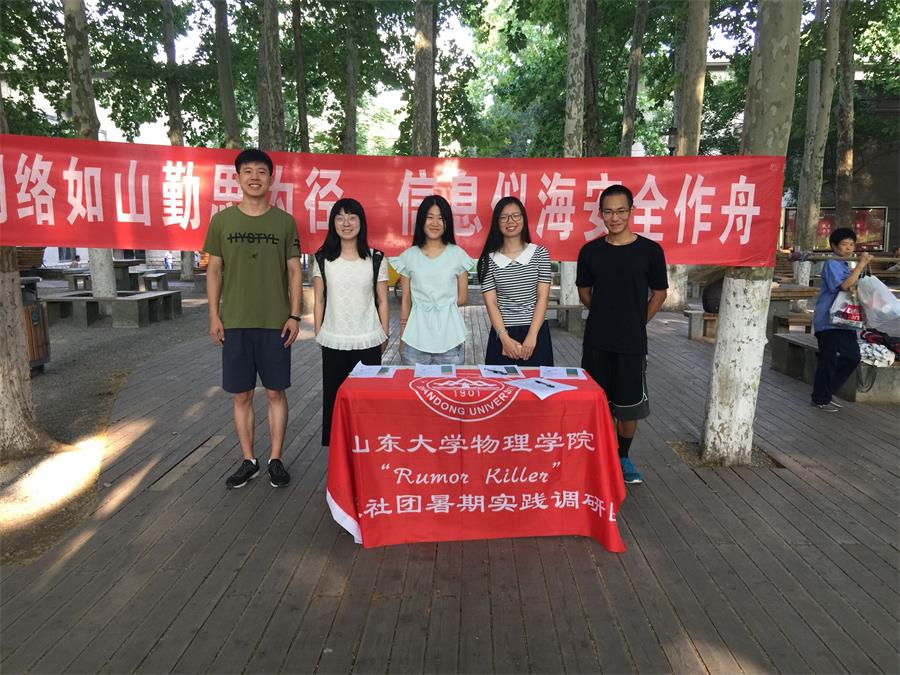 7月14日上午八点,开云手机登录入口Rumor Killer团队赴济南关于网络谣言的调研团队于山东大学中心校区小树林进行主题为“网络如山勤思为径,信息似海安全做舟”的宣讲。