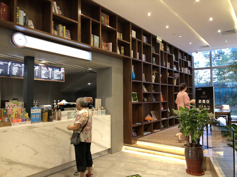 而爱书客最值得推敲的空间,是其临靠社区入口的附属咖啡烘焙区“悦客书吧”及二层少儿阅读体验区“天空之城”。“悦客书吧”是咖啡饮食与书店的结合,也是实体书店的“书店+咖啡文创”的新运营模式探索。其作为沟通社区的集散、休闲娱乐区域,是主阅读区与社区广场的链接纽带,理论上应是满足了社区交往需求。但实际中,小组成员并未见到顾客往来其中,这也许与社区人群组织结构与需求相关。据前期调研所得,中国社区的主要组成部分是具有出入时间的职业人群,而活动人群以退休老人与学龄及学龄前儿童为主。这样的差异一定程度地导致人群需求的偏移,对咖啡办公有需求的职业人群只于上下班前后以高峰流形式出现,而活动时间覆盖全天的老人与孩子对其的需求并不多。其次,来自商场内部的人流更多关注快餐式的文化消费,多数不会选择去咖啡区留下歇息。